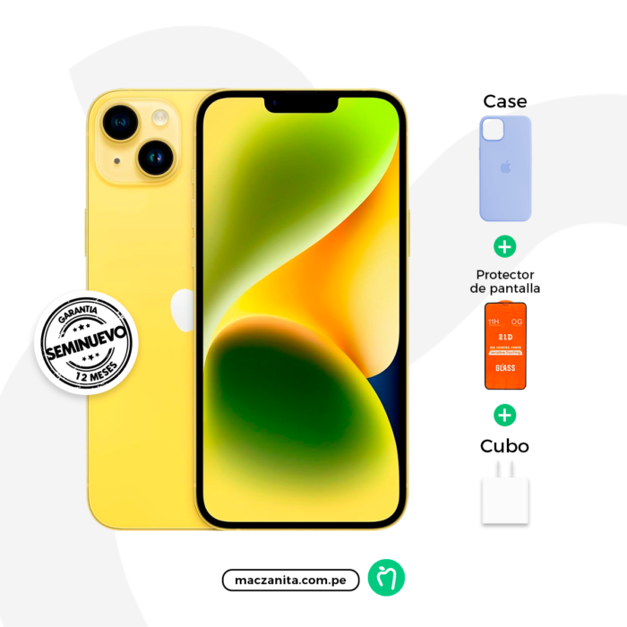 Gracias a la eficiencia del chip A15 Bionic y a sus optimizaciones internas, el iPhone 14 Amarillo Seminuevo ofrece una autonomía para todo el día, acompañando tu ritmo sin inconvenientes. Al elegir un seminuevo original en Maczanita Perú, obtienes un equipo revisado en más de 30 puntos técnicos, totalmente funcional, garantizado y listo para rendir al máximo. Más importante aún, tu compra en Maczanita Perú incluye la garantía oficial de Apple, dándote total tranquilidad. Disfruta de la experiencia fluida y segura de iOS, con acceso a las últimas actualizaciones y millones de apps. Sigue nuestras redes en Facebook, Instagram y TikTok para ver unboxings y más.