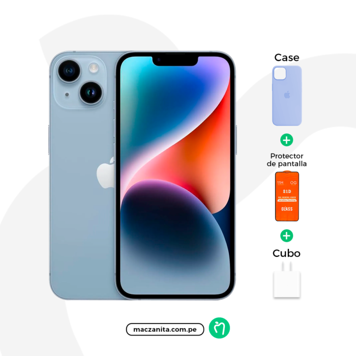 Comprar un iPhone 14 Azul claro Nuevo significa recibir un equipo sellado de fábrica, con batería al 100% de su capacidad, listo para acompañarte durante toda la jornada. Más importante aún, tu compra en Maczanita Perú incluye la garantía oficial de Apple, dándote total tranquilidad. Disfruta de la experiencia fluida y segura de iOS, con acceso a las últimas actualizaciones y millones de apps. Sigue nuestras redes en Facebook, Instagram y TikTok para ver unboxings y más.